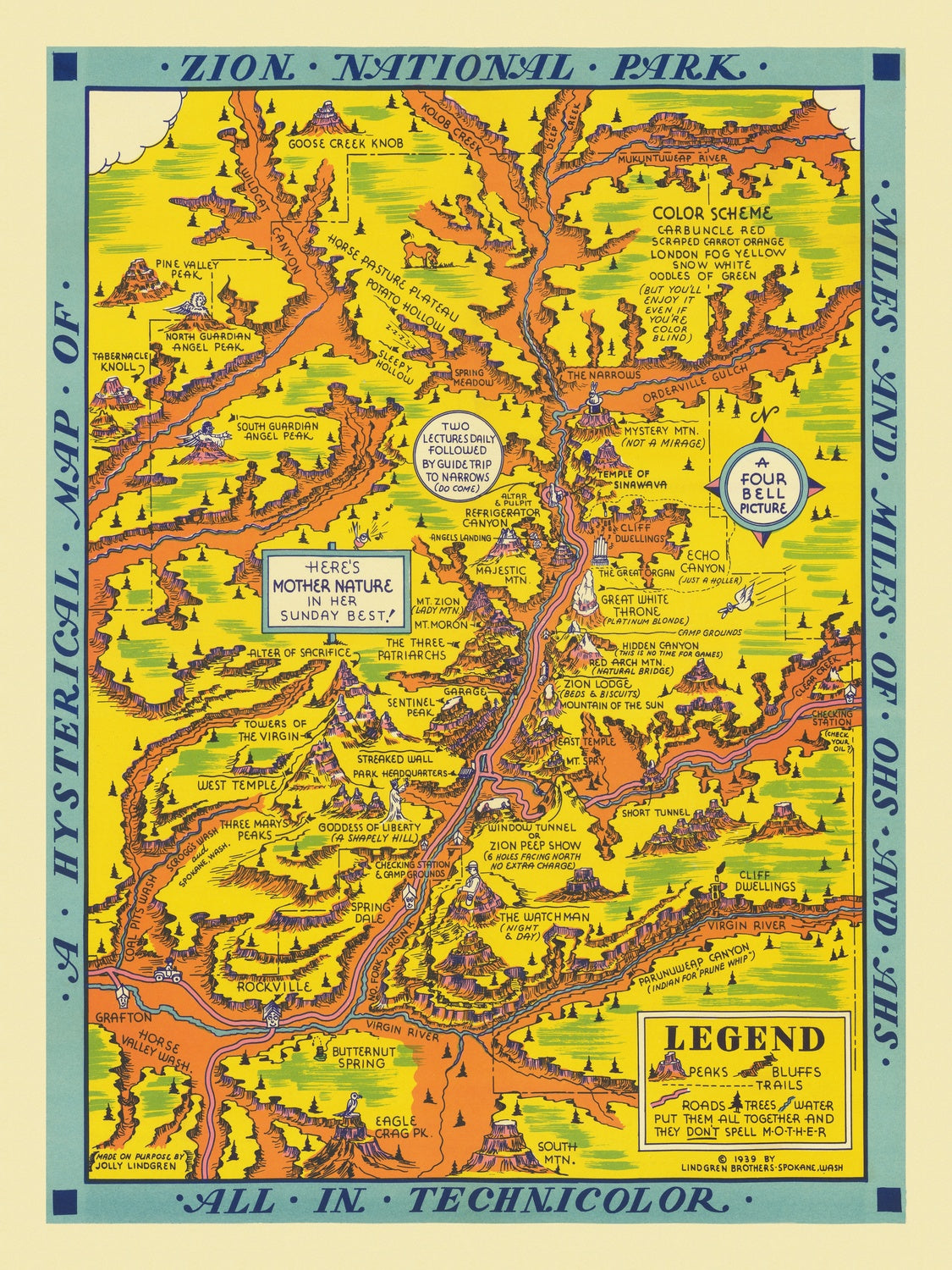 Old Pictorial Map of Zion National Park by Lindgren, 1939: Angels Landing, Watchman, Sinawava, Grafton, West Temple
