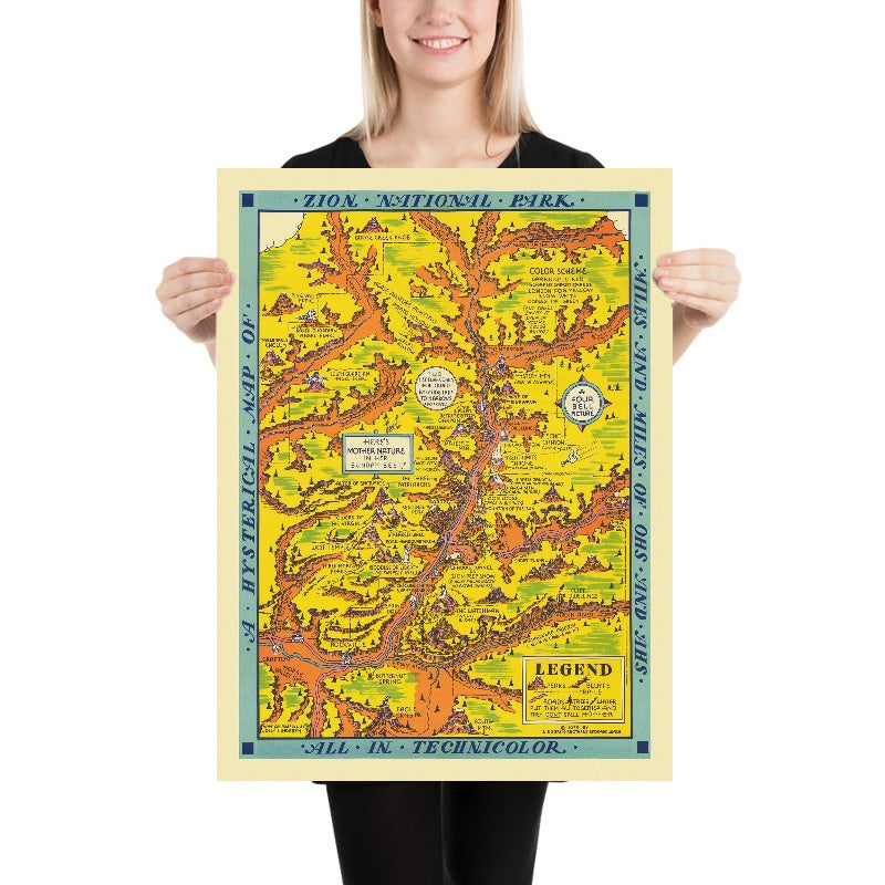 A Hysterical Map of Zion National Park distills the drama of Utah’s sandstone cathedrals into a jubilant pictorial panorama, conceived in 1939 by Jolly Lindgren of the Lindgren Brothers. With exuberant color, animated typography, and a cartouche proclaiming “HERE’S MOTHER NATURE IN HER SUNDAY BEST!,” the map channels the exuberance of interwar tourism and the vernacular humor of the American West. Lindgren’s speech bubbles and irreverent captions nudge sightseers through the canyons, letting laughter serve as a guide to awe. While its tone is playful, its content is grounded; the landscape’s defining formations are carefully placed, the roads and trails intelligible, and the rhythm of rivers and ridgelines faithfully suggested—pictorial wit married to practical orientation.
