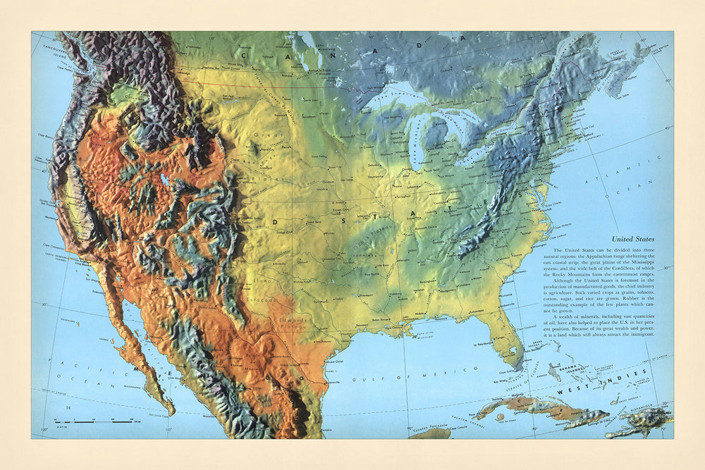 Alte Schattenschattierungskarte von Nordamerika von Debenham, 1958: Detaillierte Reliefdarstellung, Gebirgszüge