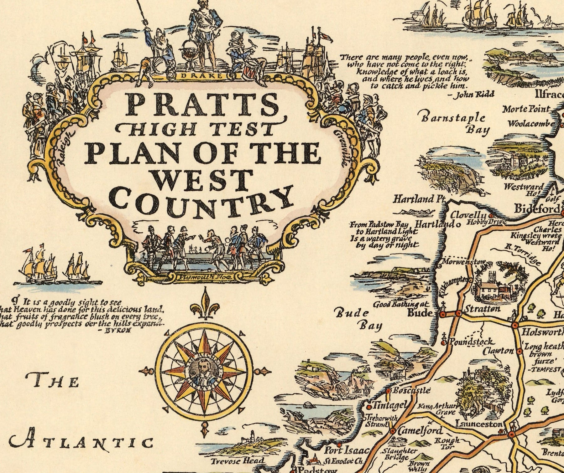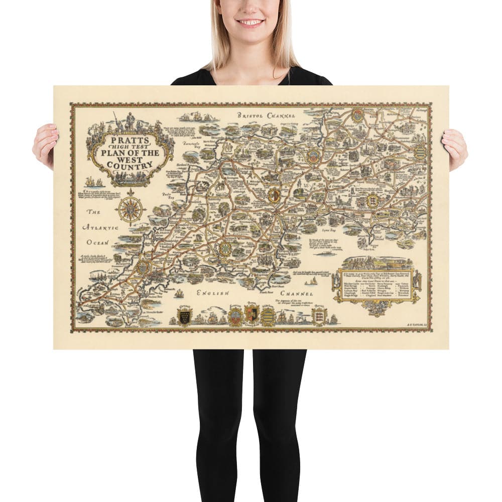 Diese faszinierende bildliche Karte des West Country wurde von A.E. Taylor erstellt und 1932 von Pratts Oil veröffentlicht - das in den USA als Standard Oil bekannt war und in wenigen Monaten in Großbritannien als Esso bekannt sein würde.