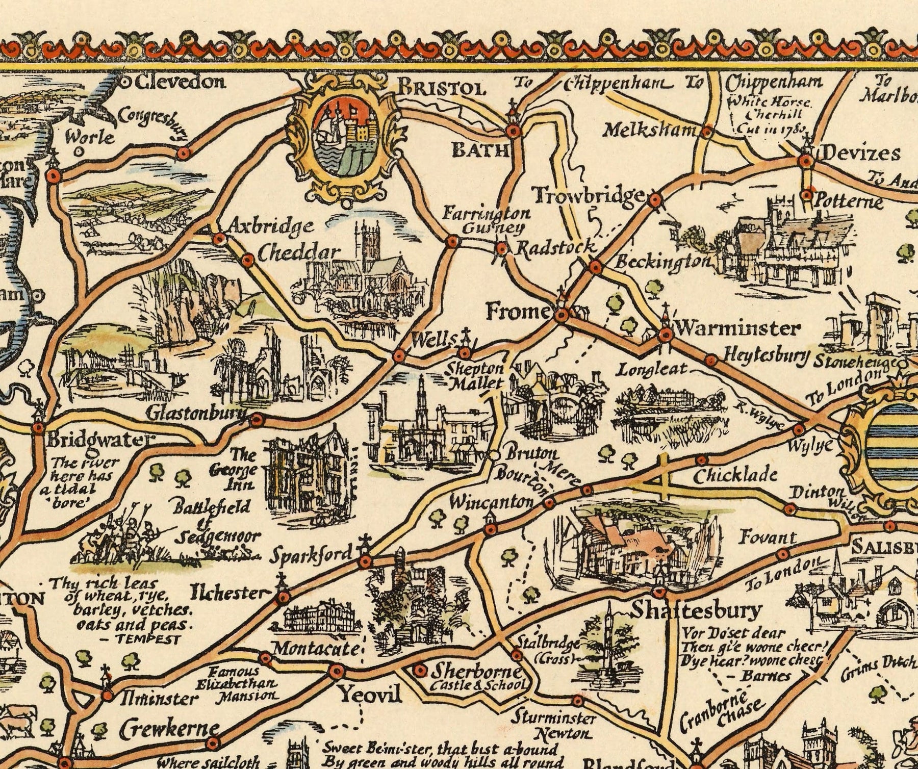 Die meisten der größeren Städte und Orte im West Country sind auf dieser Karte sichtbar - und in vielen Fällen begleitet von einer schönen kleinen Illustration der Hauptstraße der Stadt oder eines anderen bemerkenswerten Wahrzeichens. Entlang der Küste gibt es Skizzen der Klippen und Hügel, die dort zu sehen sind. Über die Karte verteilt sind Sätze aus berühmten Büchern oder Gedichten.