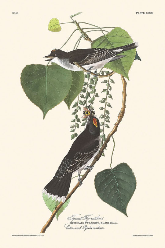 Die Illustration des Tyrannenschnäppers fällt durch ihre lebendige Darstellung des charakteristischen Verhaltens des Vogels auf. Dieser Vogel mit der lateinischen Bezeichnung Muscicapa tyrannus ist bekannt für sein furchtloses Verhalten und seinen Beschützerinstinkt. Audubon illustriert dies durch eine sorgfältige Darstellung des leuchtenden Gefieders dieser Art – eine Mischung aus dunkel bläulich-grauen Oberteilen, die mit einem grau-weißen Unterbauch kontrastieren, gekrönt von einem auffälligen zinnoberroten Fleck. Die künstlerische Meisterhaftigkeit von Audubon macht diese Illustration zu einem zeitlosen Werk für jeden Natur- und Kunstliebhaber.