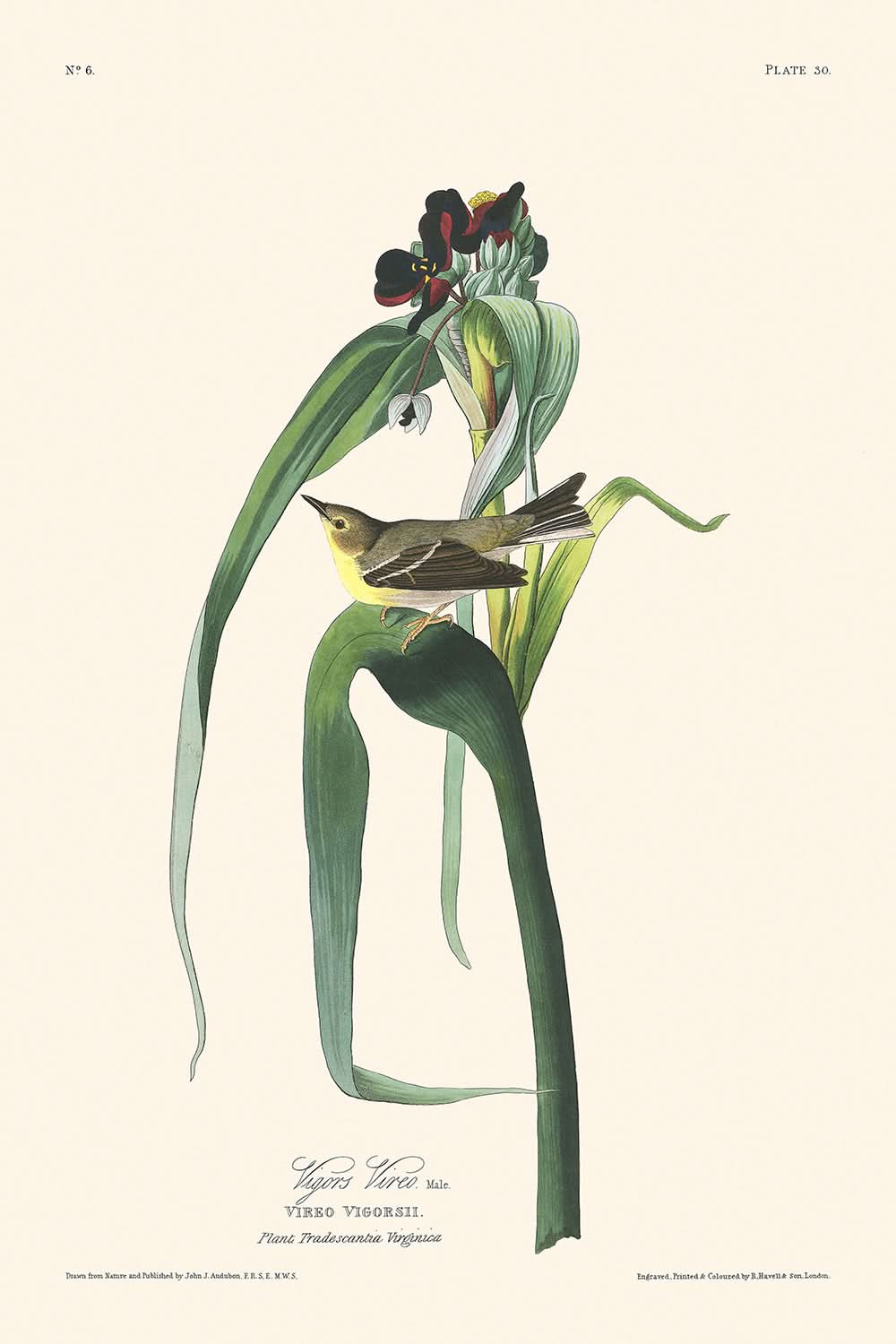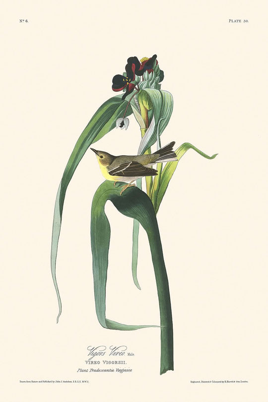 Vigors Vireo, erstmals 1827 veröffentlicht, ist eine fesselnde Illustration aus John James Audubons berühmter Serie „The Birds of America“. Diese Sammlung bleibt eine der herausragendsten Leistungen der ornithologischen Kunst und zeigt Audubons bemerkenswerte Fähigkeit, die Lebendigkeit und Essenz des Vogellebens einzufangen.