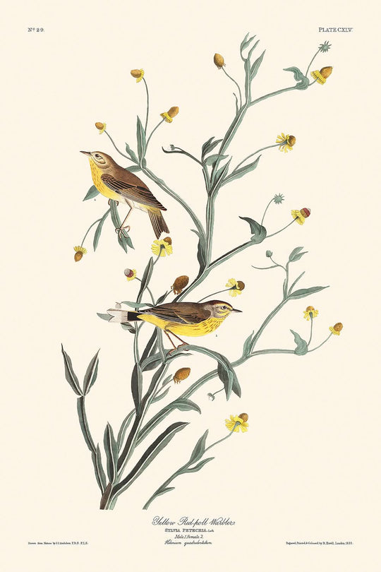 John James Audubons „Yellow Red-poll Warbler“ ist eine faszinierende Illustration aus seiner berühmten Sammlung Birds of America aus dem Jahr 1827. Audubon, ein bekannter Ornithologe und Maler, widmete sein Leben der Dokumentation der Vogelarten Nordamerikas mit außergewöhnlicher Genauigkeit und künstlerischem Talent. Seine bahnbrechende Arbeit zeigte nicht nur die Schönheit der Vögel, sondern trug auch wesentlich zu ornithologischen Studien bei, was ihn zu einer bedeutenden Persönlichkeit in Kunst und Wissenschaft machte.