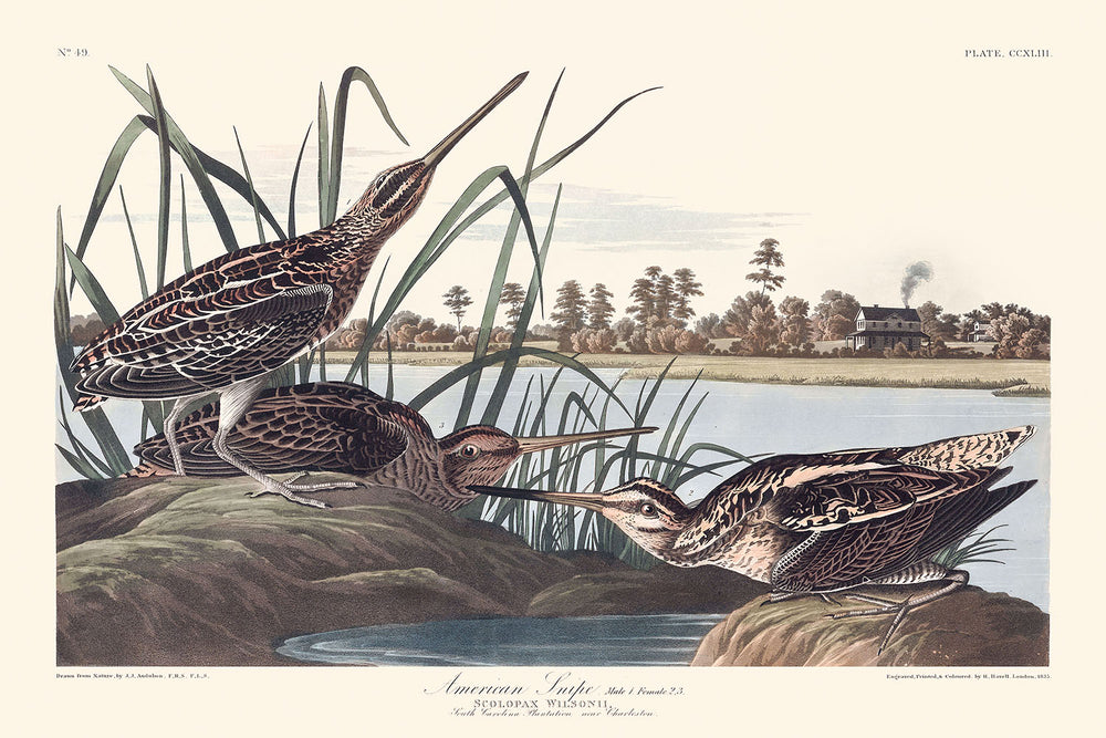"American Snipe (Placa 243)" fue publicado por primera vez en 1827 y es parte de la monumental obra de John James Audubon, Birds of America. Esta exquisita ilustración captura la esencia del American Snipe, un ave cuyas costumbres de reproducción y patrones migratorios Audubon documentó meticulosamente.
