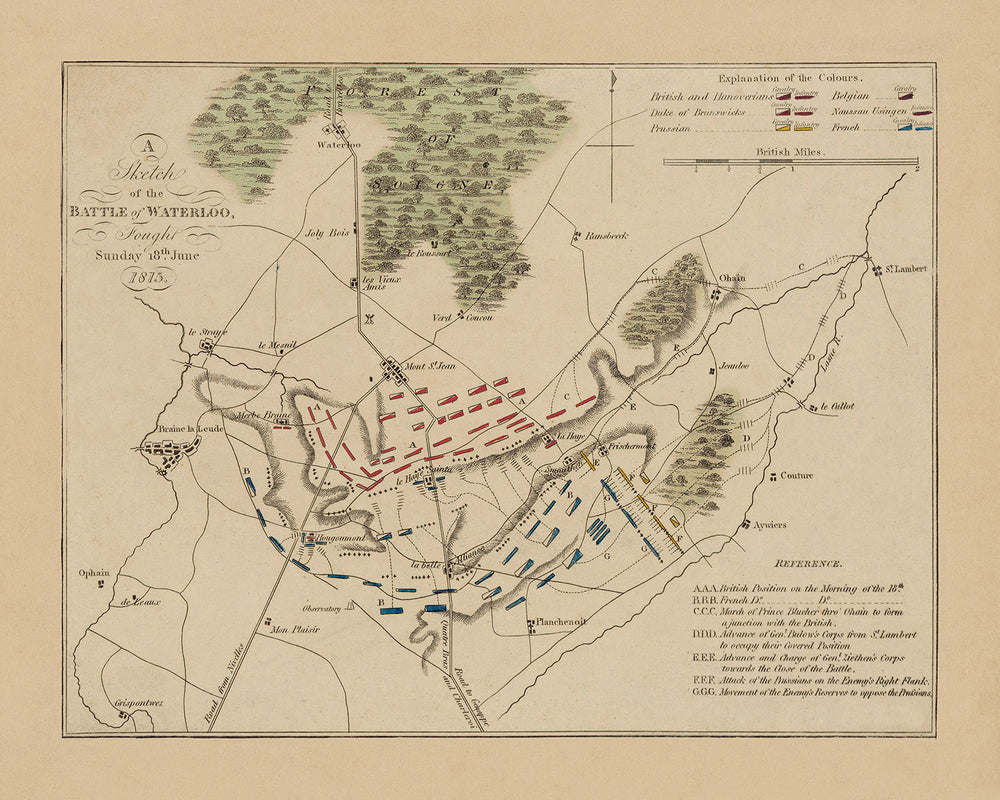 Batalla de Waterloo, posiciones británicas y francesas, 1815: Guerra Napoleónica