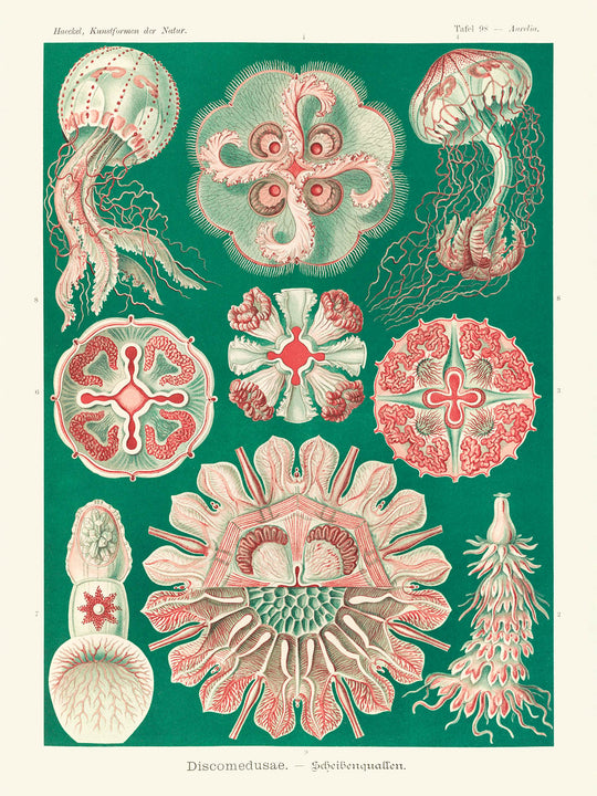 Ernst Haeckel fue un destacado biólogo, filósofo y artista alemán conocido por sus profundas contribuciones a la historia natural y la ciencia biológica. Su trabajo en "Kunstformen der Natur" es celebrado por su extraordinaria mezcla de precisión científica y creatividad artística. Las ilustraciones de medusas de Haeckel, incluyendo "Discomedusae Schweibenquallen," son particularmente notables por sus intrincados detalles y vibrantes paletas de colores.