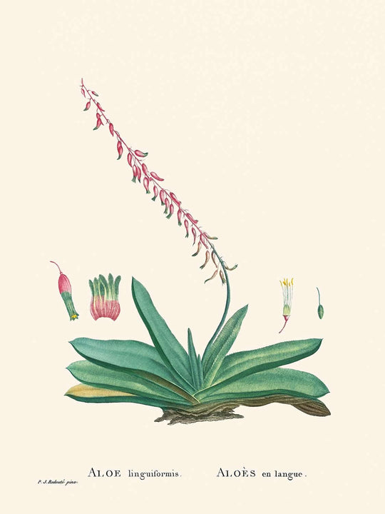 La lengua de vaca, originalmente titulada Aloe Linguiformis, es una sorprendente ilustración botánica victoriana del famoso artista Pierre-Joseph Redouté, publicada por primera vez en 1802. Redouté, a menudo llamado el "Rafael de las flores", es célebre por sus precisas y exquisitas representaciones de la flora. Su obra se hizo famosa mientras trabajaba como tutor de pintura de María Antonieta y su arte encontró un éxito continuo a instancias de Josefina Bonaparte, a quien ayudó a capturar la belleza floral del castillo de Malmaison.