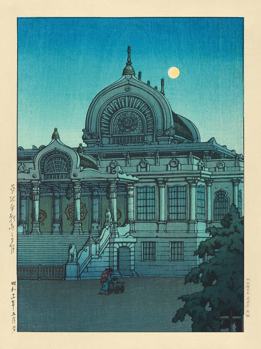 La Luna de la Tarde en el Templo Honganji en Tsukiji de Hasui Kawase es una representación sublime de la belleza tranquila inherente a las impresiones en madera japonesas de principios del siglo XX. Creada en 1935 y titulada originalmente "Tsukiji Honganji no Yūzuki" (築地本願寺の夕月), esta obra atrae al espectador a un momento de paz en el crepúsculo en el famoso Templo Honganji en el distrito de Tsukiji en Tokio. Hasui Kawase, un maestro impresor del movimiento shin-hanga, capturó la luz natural efímera a través de una técnica meticulosa, atmósfera y escenarios tradicionales.