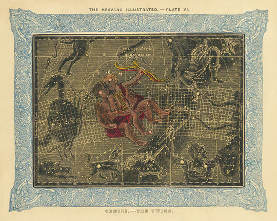 Esta impresión de arte fino de Géminis, Los Gemelos, sería un regalo perfecto para diversas ocasiones como Navidad, el Día del Padre, el Día de la Madre, fiestas de inauguración de casa, o como un presente de despedida considerado para un colega. Es una elección ideal para cualquiera que aprecie el arte fino, tenga interés en la astronomía o disfrute de la belleza atemporal de los mapas históricos.