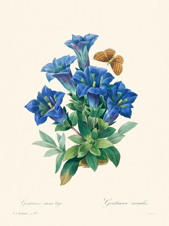 Gentiana acaulis, obra del eminente artista botánico Pierre-Joseph Redouté, es un brillante testimonio del arte de la ilustración botánica de principios del siglo XIX. Publicada en 1802, esta obra captura la delicada belleza de la Gentiana acaulis, una especie famosa por sus flores de color azul intenso, y ahora está disponible como una impresión de bellas artes.