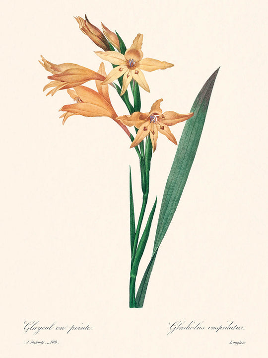"Gladiolo," publicado por primera vez en 1827, es una hermosa ilustración botánica de Pierre-Joseph Redouté. Conocido por su exquisito detalle y representaciones realistas, Redouté creó esta obra en medio de una prolífica carrera pintando la flora del Château de Malmaison a petición de Josefina Bonaparte, la esposa del General Napoleón.