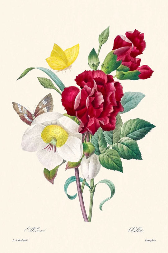 Los nombres botánicos de esta obra, como Hellebore (Helleborus) y Oeillet (comúnmente conocido como clavel), reflejan la dedicación de Redouté a la precisión botánica. Su capacidad para combinar detalles científicos con un arte exquisito lo estableció como una piedra angular en el campo de la ilustración botánica.