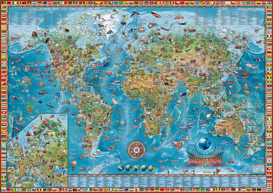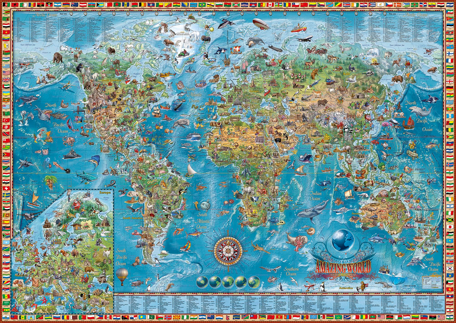 Una de las características más llamativas de este mapa es su capacidad para involucrar y educar simultáneamente. La inclusión de hitos históricos y culturales, como las maravillas de Medio Oriente y los majestuosos animales de África, proporciona un rico conjunto de información que puede despertar la curiosidad e inspirar el aprendizaje. El mapa insertado de Europa en la esquina inferior izquierda y las ilustraciones del globo terráqueo en la parte inferior realzan aún más el valor educativo del mapa, ofreciendo perspectivas adicionales sobre la geografía mundial.