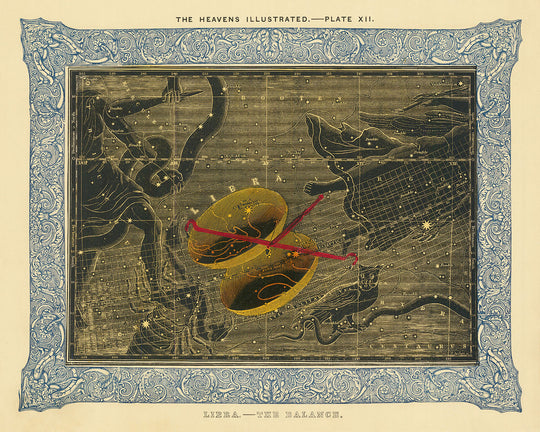Desde el uso armonioso de colores hasta las delicadas y precisas ilustraciones, esta obra de arte es un deleite visual. El mapa estelar muestra la constelación de Libra con una atención al detalle que lo hace tanto informativo como estéticamente agradable. Para aquellos fascinados por el cielo nocturno, "Libra, El Equilibrio" de Bradford sirve como un testimonio histórico de las maravillas del cosmos, despertando tanto curiosidad como admiración.