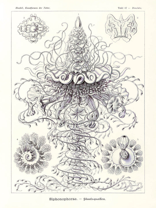 "Siphonophorae Staatsquallen (Tafel 37)" se destaca por su representación impactante de medusas, cada una meticulosamente representada con una variedad de colores que incluyen rojos vibrantes, azules calmantes y blancos opalescentes. La composición detallada muestra el talento de Haeckel para combinar la precisión científica con la gracia artística. Las formas fluidas y la transparencia de las medusas están capturadas con tal maestría que parecen casi vivas en la página, convirtiendo esta obra de arte en un punto focal cautivador para cualquier espacio.