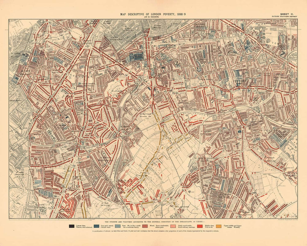 Esta es una impresión de la hoja 11 del Mapa de la Pobreza de Londres, creado por Charles Booth en 1898-9.
