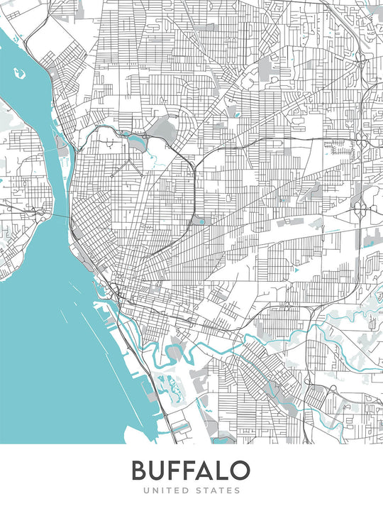 Este mapa de Buffalo, Nueva York, es un callejero moderno y detallado sin etiquetas. Se centra en la ciudad de Buffalo y sus alrededores, proporcionando una representación precisa y visualmente atractiva del diseño de la ciudad. El mapa cubre una amplia gama de vecindarios, incluidos Allentown, Black Rock, Elmwood Village y North Buffalo, cada uno con su propio carácter y encanto únicos.