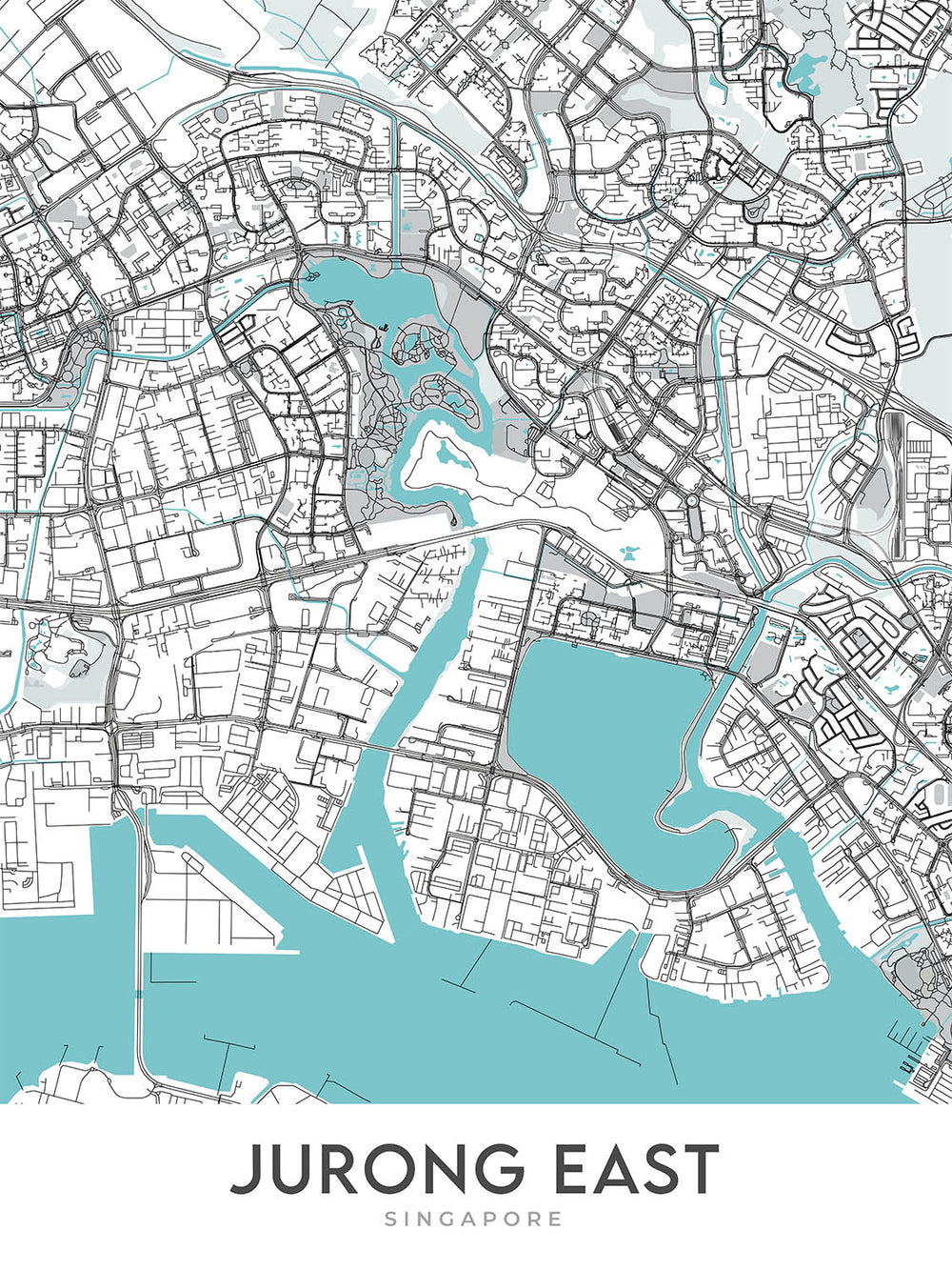 Capturando la vibrante esencia de Jurong East, este mapa contemporáneo invita a los espectadores a explorar una de las regiones más dinámicas de Singapur desde una perspectiva única. Jurong East, un próspero centro residencial y comercial, se representa en impresionante detalle, mostrando su red de carreteras, puntos de referencia y espacios verdes sin el desorden de etiquetas. Esta elección artística eleva el mapa de una simple herramienta de navegación a una pieza de arte moderno, destacando la ordenada cuadrícula de calles del vecindario y los notables hitos que la punctúan. El enfoque del mapa en Jurong East no solo refleja su importancia actual como un distrito clave en Singapur, sino también su continua transformación y crecimiento, convirtiéndolo en un tema fascinante tanto para residentes como para admiradores del diseño urbano.