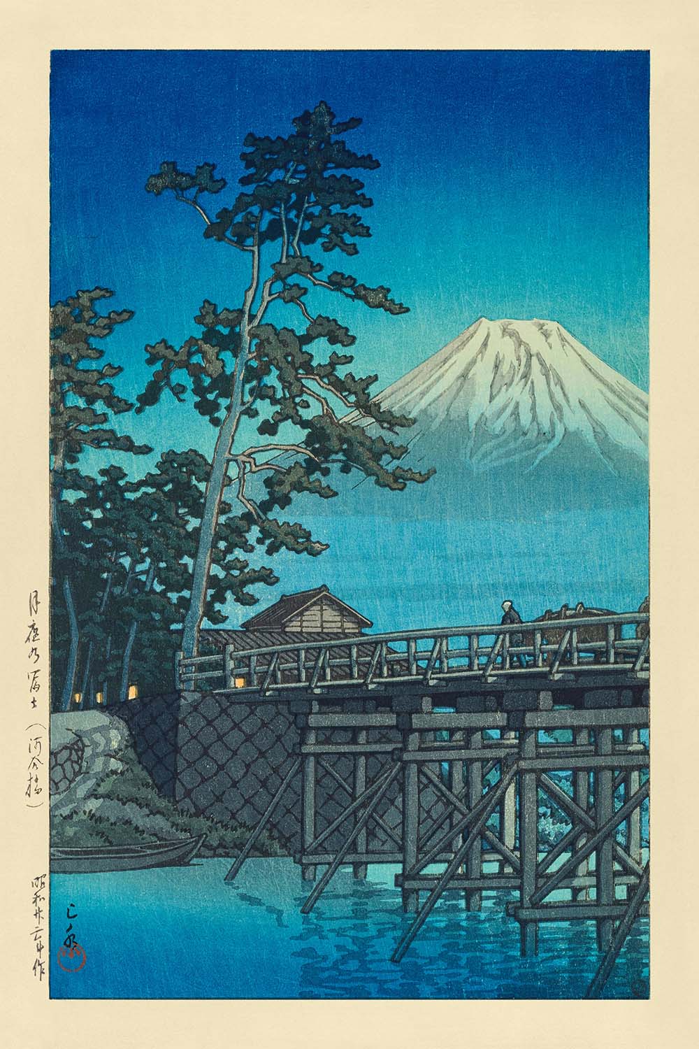 El Monte Fuji a la Luz de la Luna, el Puente Kawai de Hasui Kawase es un ejemplo radiante del arte de la impresión en madera shin-hanga japonés, publicado originalmente en 1935. Este paisaje nocturno tranquilo captura la icónica silueta del Monte Fuji, bañado en etérea luz de luna y visto desde el suavemente arqueado Puente Kawai. El título japonés original de esta obra es 「月夜の富士川合橋」(Tsukiyo no Fuji Kawaibashi), rindiendo homenaje tanto a la majestuosa montaña como a la suave noche que envuelve el sereno paisaje.