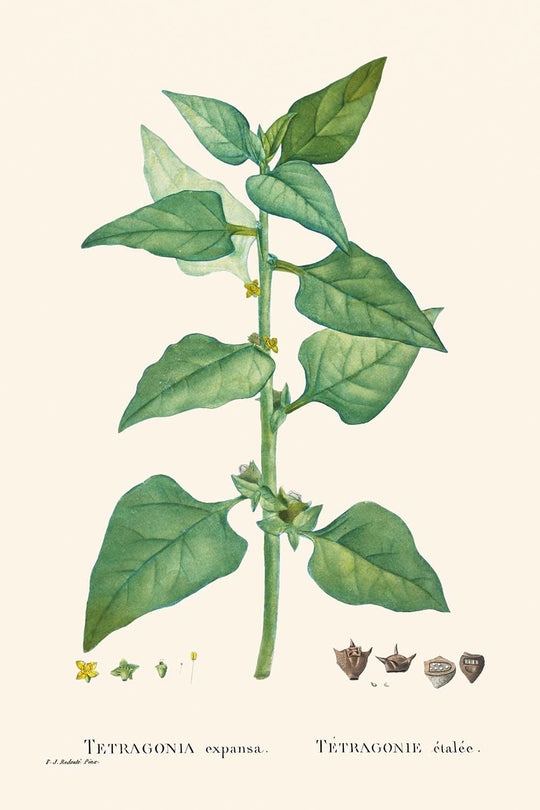 Descubra la exquisita belleza de la "Espinaca de Nueva Zelanda" de Pierre-Joseph Redouté, una impresionante ilustración botánica publicada por primera vez en 1802. Esta obra de arte es un excelente ejemplo de la ilustración botánica victoriana, que muestra la habilidad magistral de Redouté para capturar las delicadas complejidades de la flora. Conocido como uno de los mejores ilustradores botánicos, Redouté pasó gran parte de su vida pintando los esplendores florales del Château de Malmaison por orden de Josefina Bonaparte, esposa de Napoleón. Esta ilustración en particular, titulada originalmente "Etragonia Expansa", captura la esencia y la belleza de la espinaca de Nueva Zelanda.