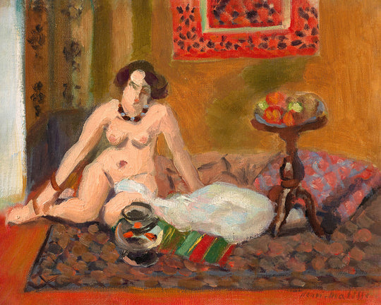 La obra maestra de Henri Matisse de 1921 "Nu accroupi près d’un aquarium" (Desnudo en cuclillas cerca de un acuario) es un ejemplo impresionante del color audaz y la forma innovadora que caracterizó gran parte de su trabajo. Matisse, reconocido como una figura destacada en el arte moderno, fue parte del movimiento fauvista, conocido por su uso exuberante del color y su pincelada expresiva, que contrastaba con los movimientos artísticos anteriores.