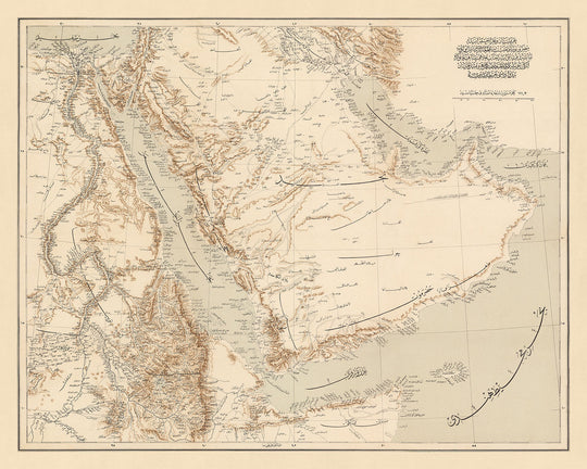 El mapa de la 'Península Arábiga y el Mar Rojo', publicado originalmente en 1897 por el Estado Mayor del Ejército Otomano, es una pieza notable de la historia cartográfica. Como un mapa político y físico detallado, ofrece una visión completa de la Península Arábiga, capturando la esencia de la región durante finales del siglo XIX. El mapa abarca una amplia área geográfica, que incluye Egipto, Sudán, Somalia, el Golfo Pérsico y el Océano Índico. Representa meticulosamente divisiones políticas y reinos, ciudades, pueblos, caminos, senderos, ríos, lagos y montañas. El río Nilo, uno de los ríos más largos del mundo, está bellamente representado desde su fuente hasta su desembocadura, demostrando la atención al detalle del mapa.