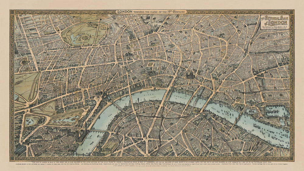 Antiguo mapa a vista de pájaro de Londres en 1892 por Charles Baker & Co: Westminster, City of London, Lambeth, Covent Garden, Marylebone