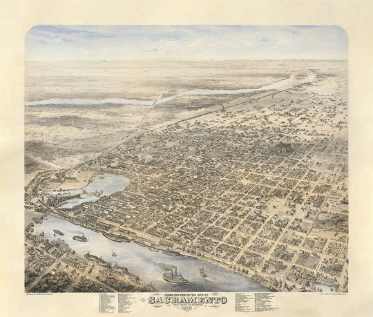 El mapa mira la ciudad desde un punto al oeste de la ciudad, mirando hacia el este, con el río Sacramento y el centro de la ciudad en primer plano y el río Americano hacia la parte posterior izquierda.