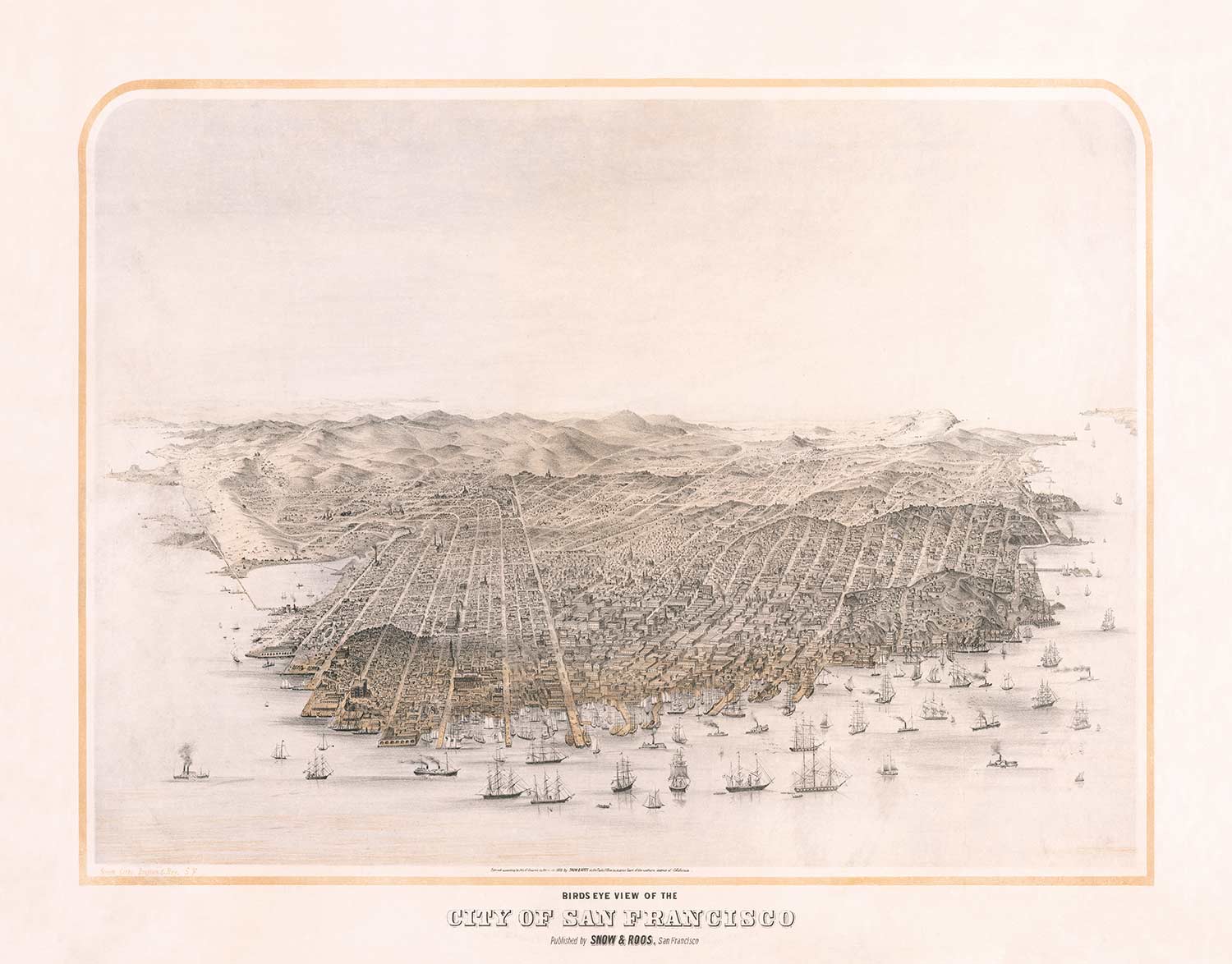Mapa de ojos Old Birds de San Francisco en 1868: Área de la Bahía, Golden Gate, Gold Rush, Nob Hill, North Beach