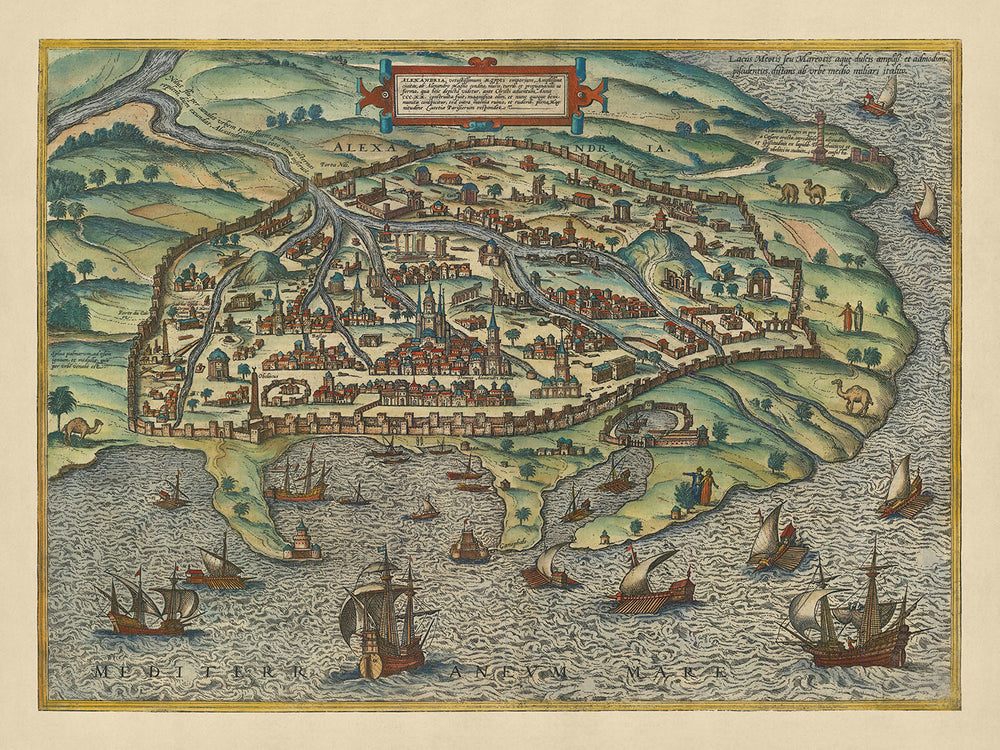 Mientras exploras el mapa, notarás los canales meticulosamente dibujados que fluyen a través de la ciudad, reflejando la conexión vital de Alejandría con el Mar Mediterráneo. La presencia de barcos en el puerto enfatiza aún más el papel de la ciudad como importante centro comercial en el mundo antiguo. Las ilustraciones de camellos y otras figuras que lo rodean ofrecen una visión de la vida cotidiana y la vibrante cultura de los habitantes de la ciudad.