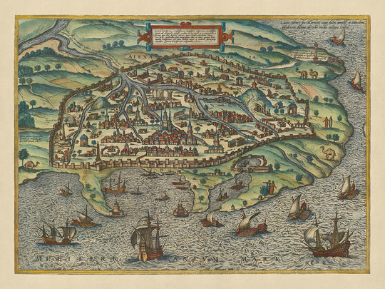 La magistral cartografía de Georg Braun no sólo captura el diseño físico de Alejandría sino también su esencia histórica. El mapa es una narración visual de la evolución de la ciudad, desde su fundación por Alejandro Magno hasta su prominencia bajo el Imperio Romano. El trabajo de Braun es un testimonio de su dedicación a preservar el legado de las grandes ciudades del mundo, y este mapa de Alejandría es un ejemplo brillante de su arte y atención al detalle.