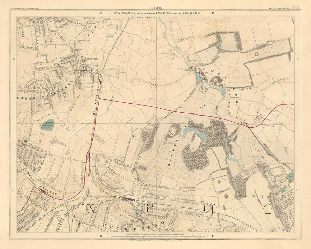 El mapa se publicó originalmente en 24 hojas. En total, el mapa habría medido aproximadamente 2 metros de ancho (78 pulgadas). Este aquí es la hoja 24, que se centra en los distritos del sureste de Londres de Bromley, Lewisham y Southwark.