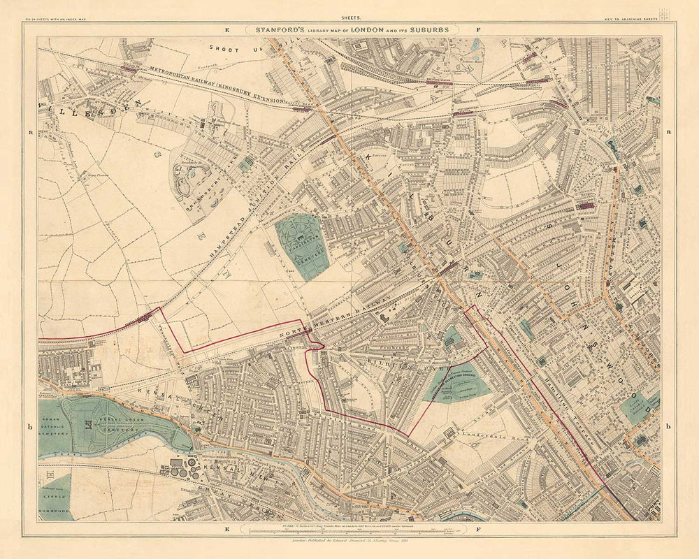 Antigua Mapa de Color de Londres Oeste, 1891: St Johns Wood, Kilburn, Kensal Green, Finchley Rd, Willesden