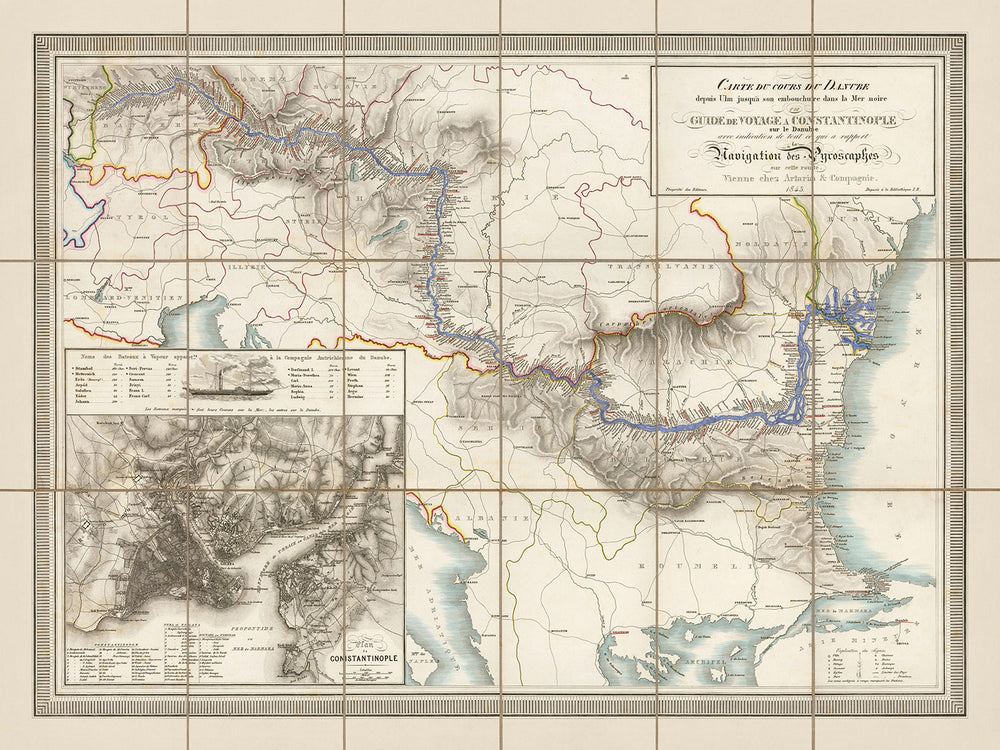 El mapa también incluye un boceto de un barco de vapor y una tabla en el centro, identificando los 25 barcos de vapor operados por la Compagnie Autrichienne du Danube (Compañía Austriaca del Danubio). Cada barco de vapor está listado con su tamaño, proporcionando información valiosa sobre las capacidades de transporte del río en ese momento. Además, se incluye un mapa detallado de Constantinopla, la actual Estambul, en la esquina inferior izquierda, ofreciendo una mirada más cercana a esta ciudad significativa.