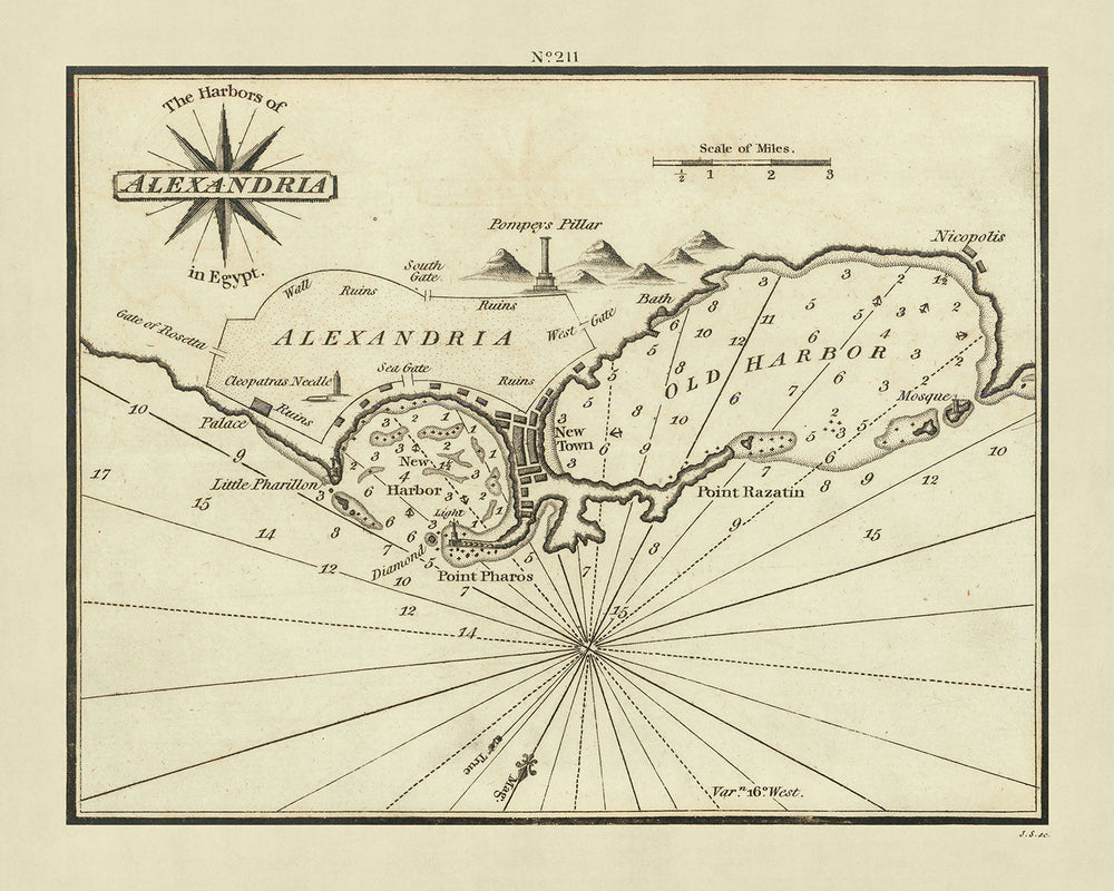 Carta Náutica del Viejo Puerto de Alejandría por Heather, 1802: El Obelisco de Cleopatra, El Pilar de Pompeyo, Mezquita