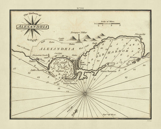 Además, el mapa no escatima en mostrar el patrimonio arquitectónico de Alejandría. Marca meticulosamente las ubicaciones de las murallas de la ciudad, puertas e incluso las antiguas calles, junto a ruinas notables como la Columna de Pompeyo, el Obelisco de Cleopatra y Nicópolis. Estos elementos no solo guían al marino, sino que también educan al historiador, al arqueólogo y al viajero curioso sobre el rico tapiz de narrativas históricas que encarna Alejandría.