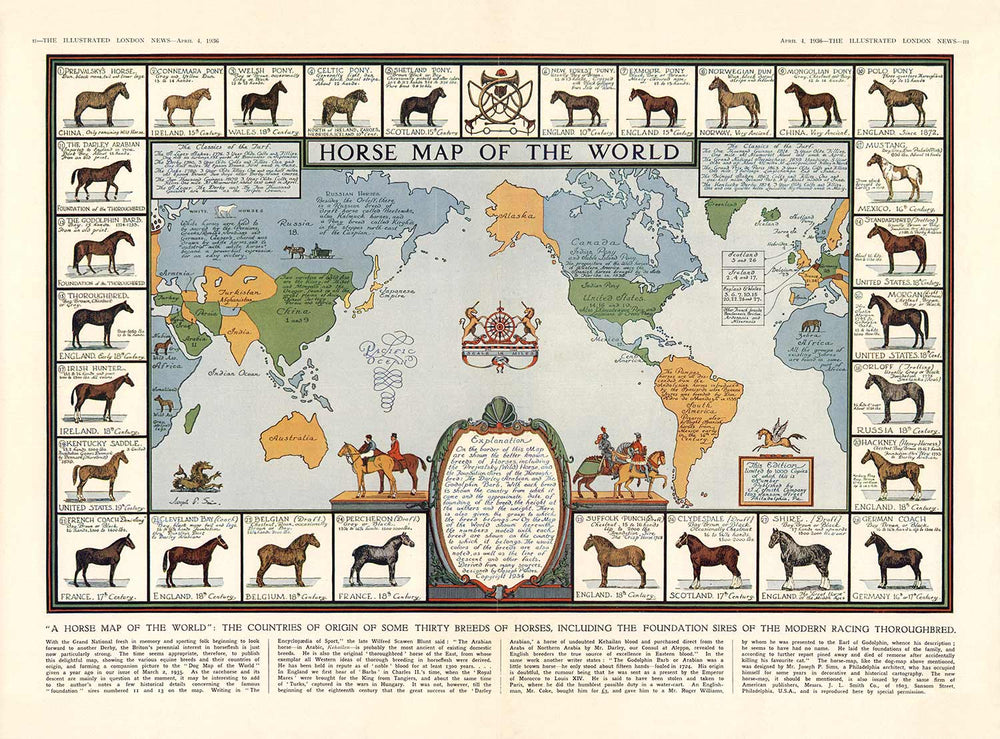 El propio mapa contiene muchas notas sobre los orígenes de las diferentes razas de caballos y datos generales sobre los caballos.