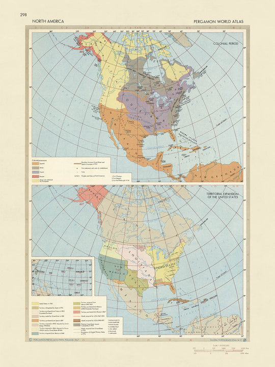 El mapa 'Infografías de la Era Colonial de América del Norte y Expansión' es un viaje fascinante a través del tiempo, capturando la esencia de una era crucial en la historia de los Estados Unidos. Publicado en 1967 por el Servicio de Topografía del Ejército Polaco, muestra el Período Colonial y la Expansión Territorial de los EE. UU. de una manera cautivadora e informativa. Como un mapa infográfico, proporciona una representación visualmente atractiva de datos históricos, convirtiéndolo en un recurso invaluable para entusiastas de la historia, educadores y estudiantes por igual. El mapa no solo ilustra los límites geográficos de la era, sino que también presenta los eventos y transacciones que llevaron a la formación de los Estados Unidos tal como los conocemos hoy.