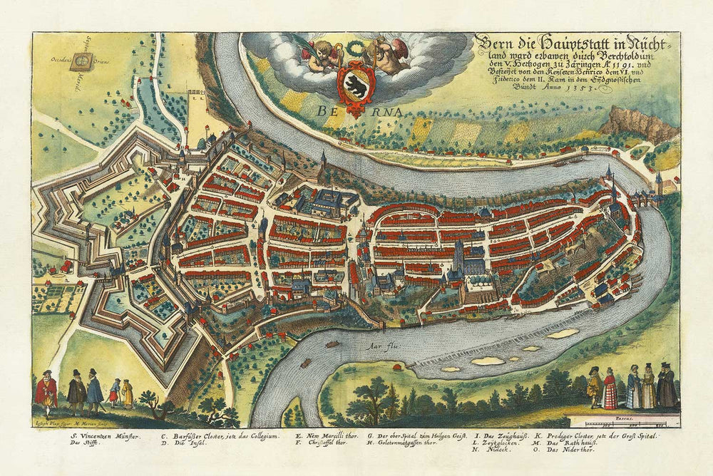 Un mapa a mano coloreado que celebra el 300 aniversario de Berna, la capital federal de Suiza, que se unió a la Confederación Suiza en 1353. Describe la fundación de Berna en 1191 y muestra las principales carreteras y edificios de la ciudad, así como el puente Untertorbrücke y el río Aare.