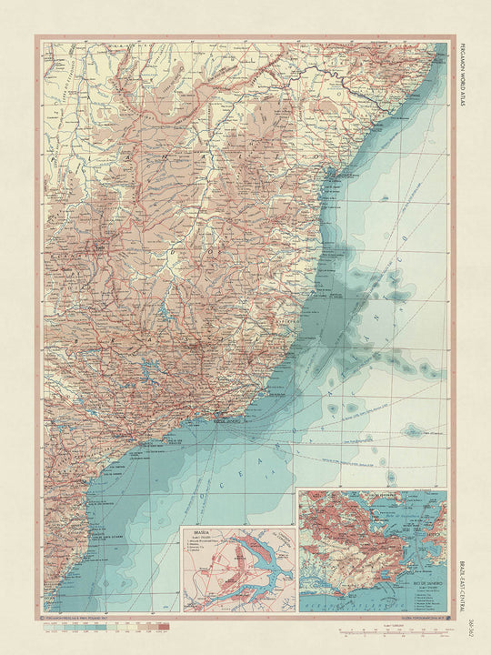 El mapa está meticulosamente elaborado, con detalles intrincados y colores vibrantes que dan vida a la región. Las características físicas están claramente delineadas, con montañas, ríos y bosques representados con gran detalle. Los límites políticos también están claramente marcados, lo que facilita la identificación de los diferentes estados y municipios dentro de la región. El mapa también incluye mapas insertados de Brasilia y Río de Janeiro, lo que brinda una mirada más cercana a estas importantes ciudades.