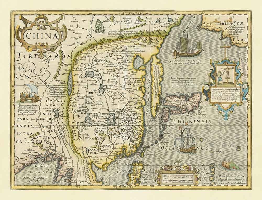 Una magnífica mapa de China de 1606 por el maestro cartógrafo holandés Jodocus Hondius - posiblemente el mejor mapa antiguo de China jamás creado. Gran parte de Asia Oriental también se puede ver en este mapa, incluyendo Corea como una isla (!), Japón, Filipinas, e incluso un poco del noroeste de América del Norte.