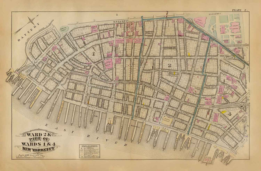 Este mapa cubre el Distrito 2 y partes de los Distritos 1 y 4 de las divisiones municipales históricas de la ciudad de Nueva York, que equivale al actual Distrito Financiero y Centro Cívico en el centro de Manhattan.