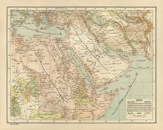 En una escritura que evoca la elegancia y complejidad de la época, el mapa está inscrito en turco otomano, con nombres de lugares representados en escritura árabe y turca otomana. Esta elección lingüística no sólo aumenta la autenticidad del mapa sino que también refleja las complejidades culturales y administrativas del Imperio Otomano. Es un guiño a la rica herencia del imperio, un crisol de lenguas, religiones y culturas que prosperaron bajo el dominio otomano. El guión dual sirve como recordatorio del vasto alcance del imperio y su capacidad para abarcar una multitud de identidades dentro de sus fronteras.