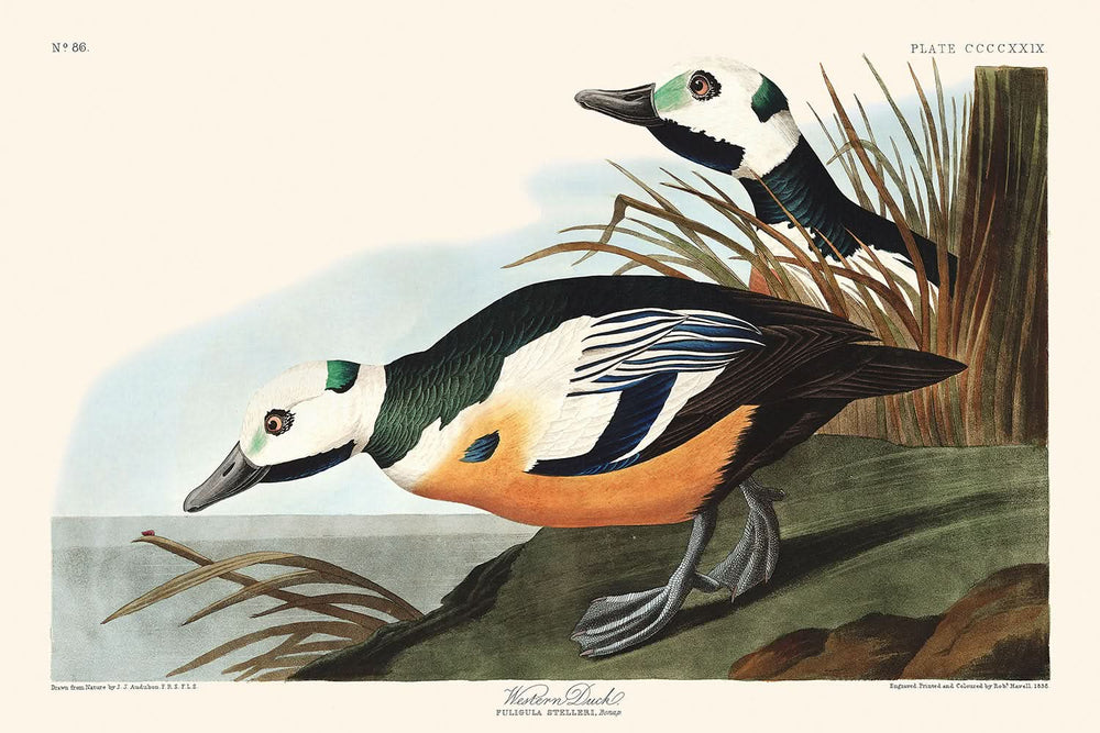 "Western Duck" de John James Audubon, publicada por primera vez en 1827, es una fascinante ilustración que aparece en Birds of America de Audubon. Esta obra en particular presenta al exquisito pato occidental, una especie con una rica historia de exploración pero que sigue siendo esquiva en las costas del Atlántico.
