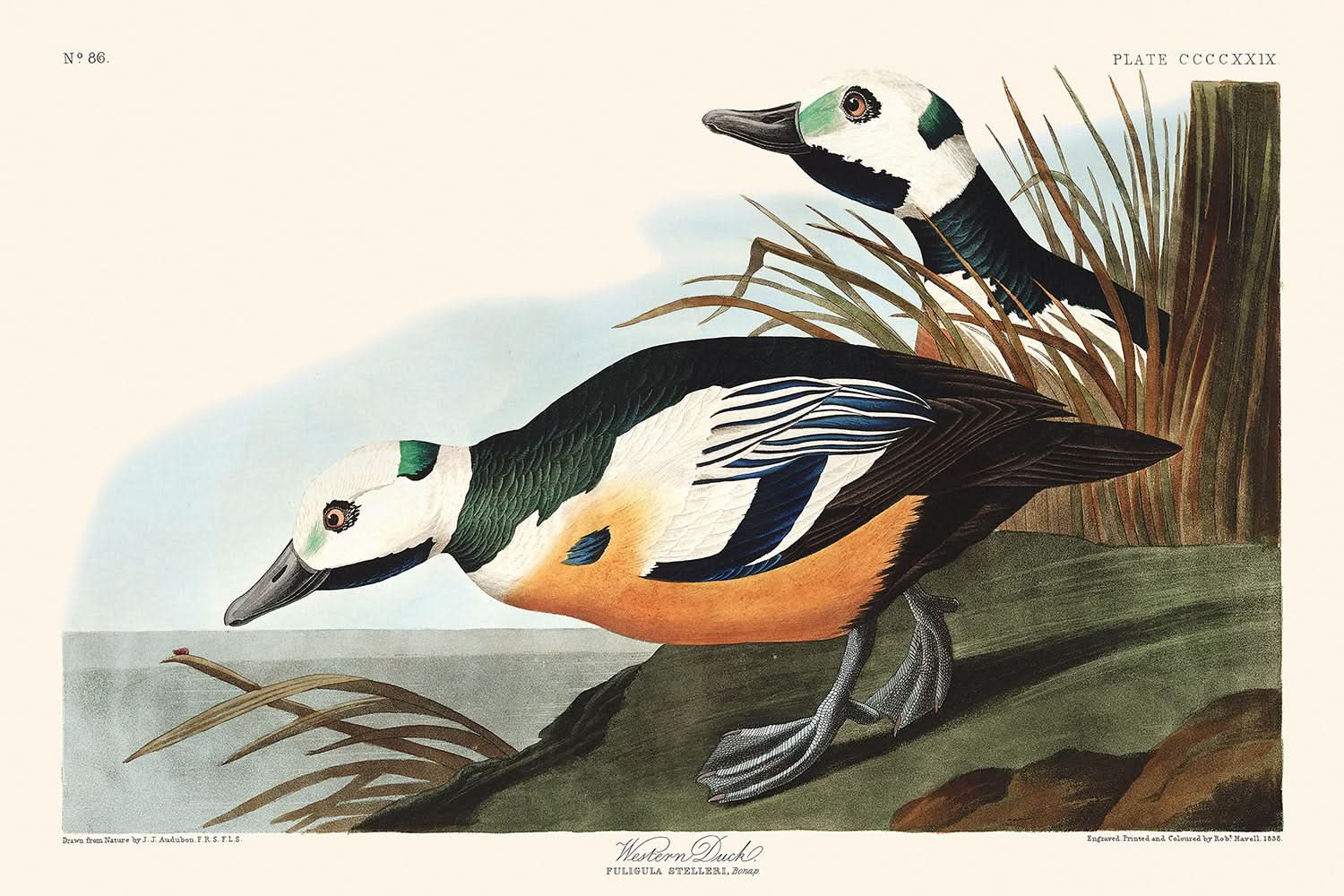 John James Audubon fue un destacado naturalista y pintor, reconocido por su importante contribución a la ornitología con sus detalladas ilustraciones a tamaño natural de aves americanas. Birds of America es una obra monumental que contiene 435 ilustraciones, muy admirada por su precisión artística y científica. Estas ilustraciones, como la del pato occidental (Anas dispar o Anas stelleri), ofrecen una ventana a la diversa vida aviar descubierta en las costas de América del Norte.