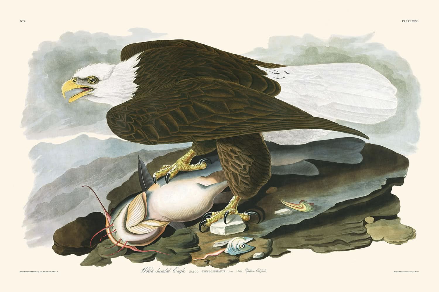 Águila de cabeza blanca (Lámina 31), publicada por primera vez en 1827 por el reconocido artista John James Audubon, es una notable ilustración del célebre compendio de Audubon, The Birds of America. Esta pieza captura la majestuosidad y el poder del águila de cabeza blanca, famosa por ser venerada como el emblema de la fuerza y la libertad.