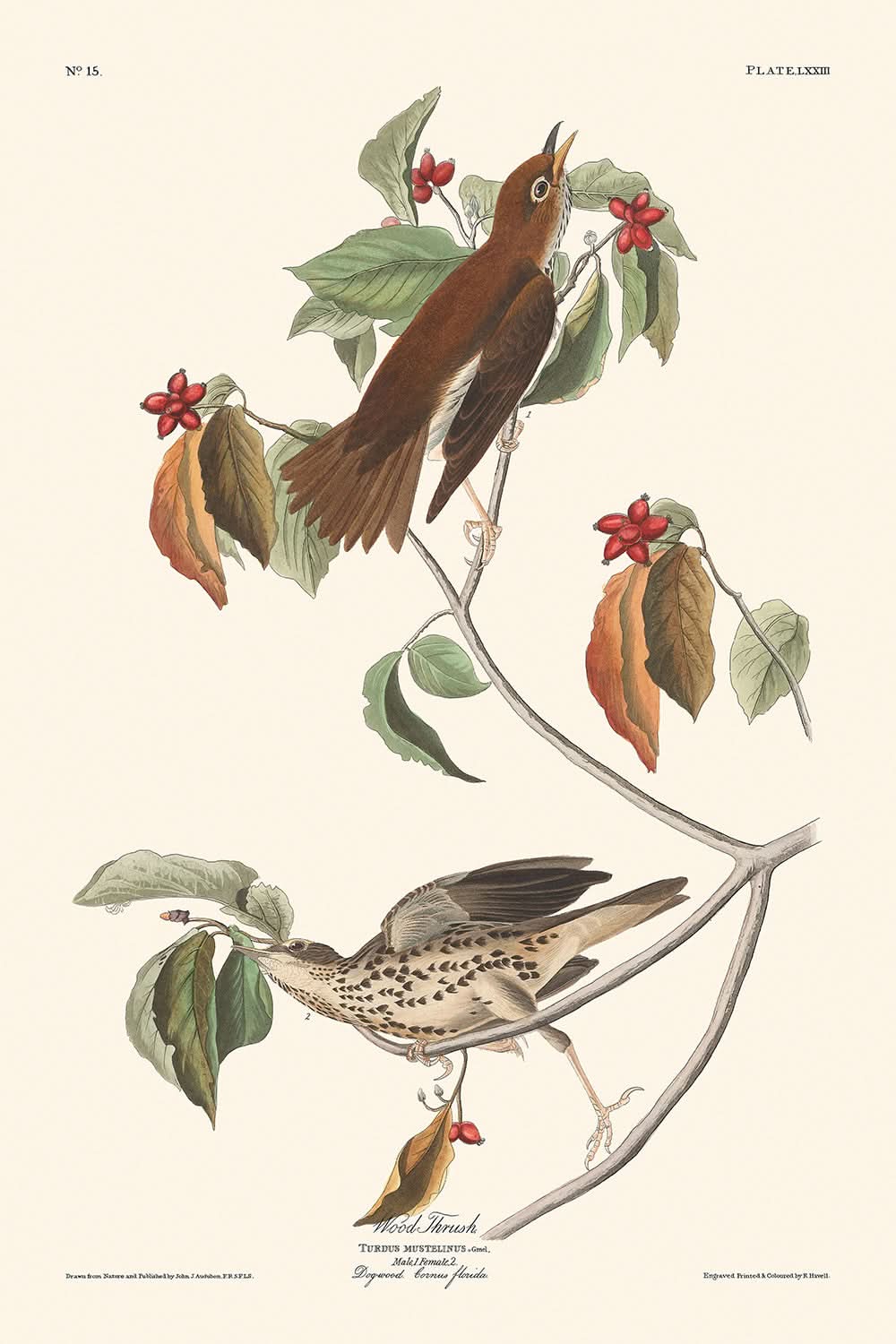 Colorida y cautivadora, la ilustración muestra la maestría de Audubon a la hora de reproducir los vivos tonos otoñales del cornejo junto al encantador zorzal de bosque. Las partes superiores de color marrón amarillento cálido del ave y las partes inferiores blancas y moteadas en contraste están representadas con exquisito detalle. Esta impresión no solo captura la belleza estética del ave y su entorno, sino también una historia de compañerismo y fortaleza que se encuentran en la naturaleza.