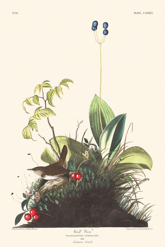 Las características estéticas de la estampa del Wood Wren incluyen su rico plumaje marrón rojizo sutilmente entrelazado con tonos grises, y su composición mesurada que refleja los matices del comportamiento del ave. Para los coleccionistas de obras de Audubon, el Wood Wren (cuyo nombre científico es Troglodytes americana) ofrece un testimonio esencial de la riqueza descriptiva y la profundidad contextual por las que Audubon era reconocido.
