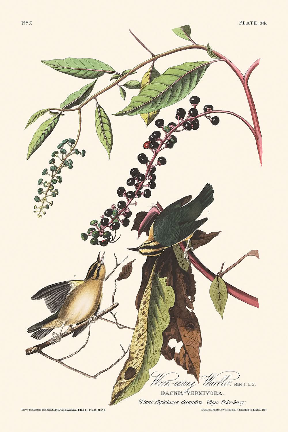 La curruca devoradora de gusanos (Lámina 34), creada por John James Audubon en 1827, es una ilustración cautivadora de su célebre serie Birds of America. Esta obra de arte no solo muestra la profunda habilidad de Audubon para capturar la intrincada belleza de la vida aviar, sino que también refleja sus agudas observaciones del mundo natural, que han sido veneradas durante generaciones.